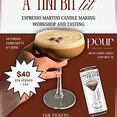 Join us Saturday, February 21st at 6pm for the PERFECT ladies night out - an espresso martini themed candle making workshop, followed by an espresso martini tasting provided by Let's Be Frank canned espresso martinis! Enjoy light refreshments from 7-7:30pm while you wait for your candle to solidify! You will get to bring your candle (and some other surprise espresso martini themed goodies) home with you after the class! So grab your girls and let's get a 'tini bit lit! Date & Time: Saturday, February 21st from 6 - 7:30pm Price: $40 per person + tax Location: Pour Candle Bar & Chandlery 405 W. Perry Street, Cape May, NJ 08204 Cancellation Policy: NO refunds will be provided for cancellations on special events!